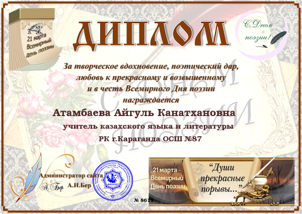 21-наурыз Дүниежүзілік поэзия күні, осыған орай мектебіміздің қазақ тілі мен әдебиет пәндерінің мұғалімдері марапатталды.