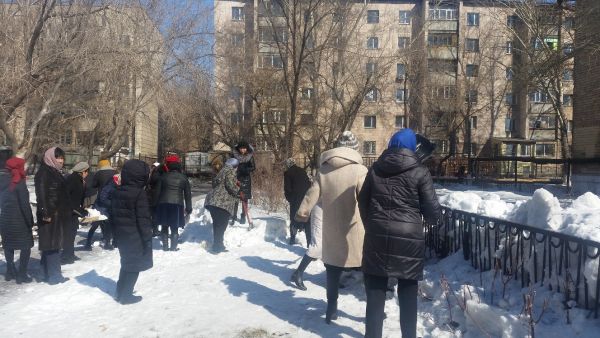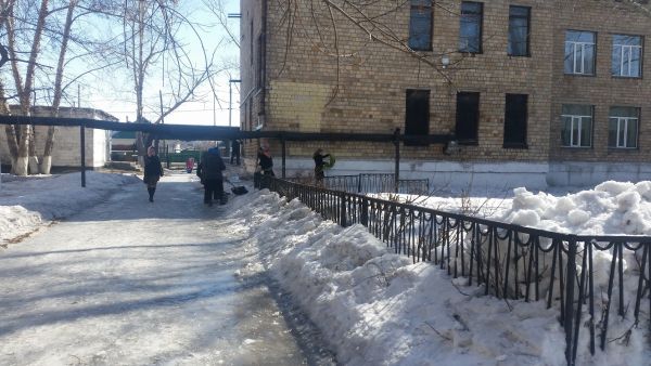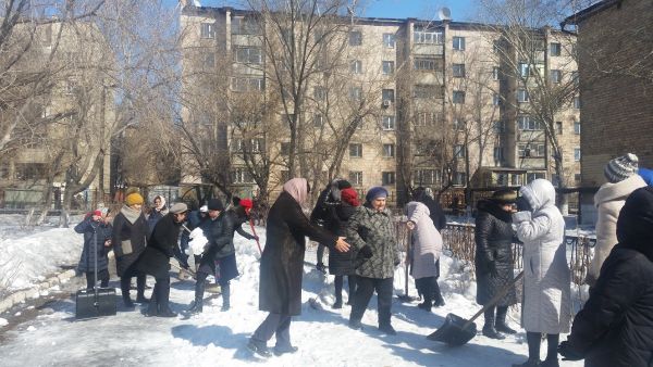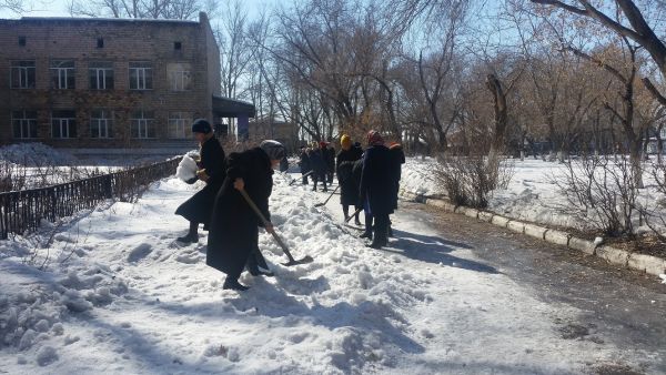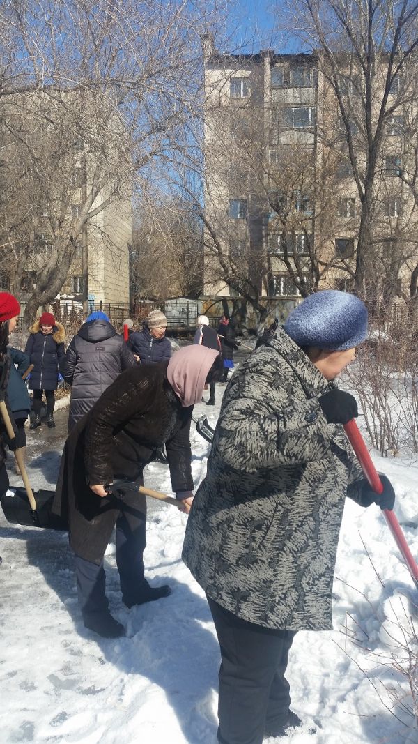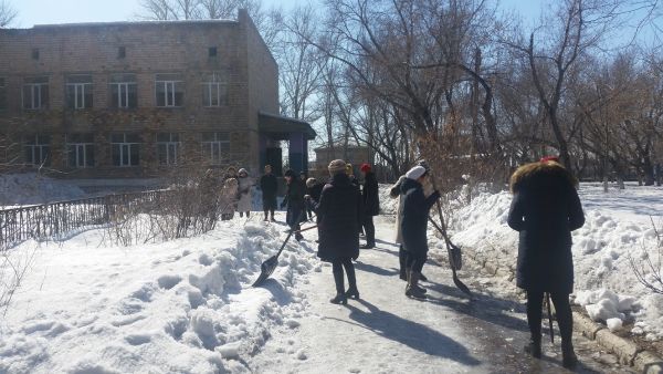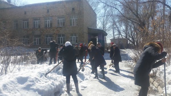 18.03.2019 жылы мектеп қызметкерлері мектеп ауласын қардан тазалауға қатысты