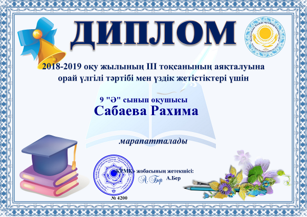2018-2019 оқу жылының 3 тоқсанының аяқталуына орай үлгілі тәртібі мен үздік жетістіктері үшін оқушылар дипломмен марапатталды