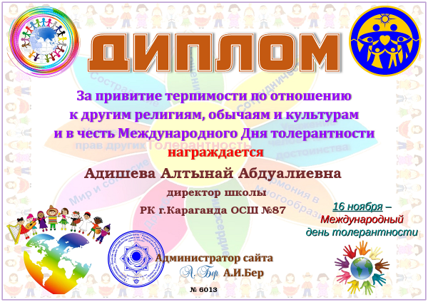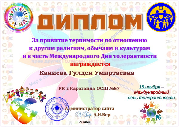 Халықаралық Толеранттылық күніне орай "Филолог" порталының координаторы Каниева Гулден Умиртаевна мектебіміздің ең белсенді қызметкерлерін Дипломмен марапаттады.
