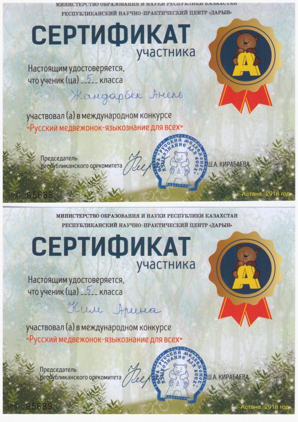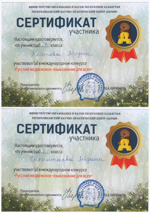 "Русский медвежонок-языкознание для всех" халықаралық конурсының сертификат иегерлерін құттықтаймыз.