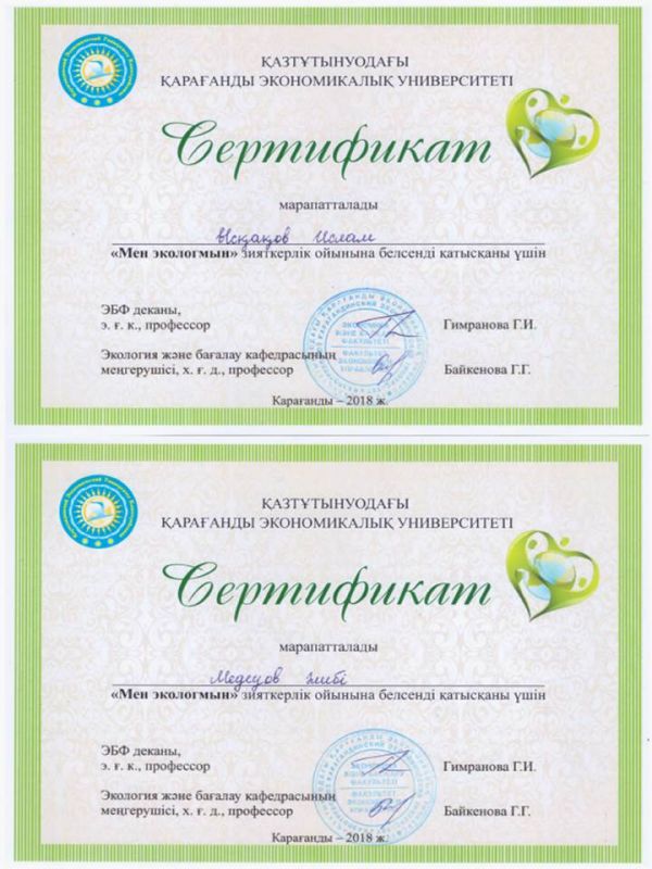 Қазтұтынудағы Қарағанды экономикалық университетінің ұйымдастыруымен өткізілген "Мен экологпын" зияткерлік ойынына белсенді қатысқаны үшін мектебіміздің оқушылары сертификатқа иеленді.&nbs…