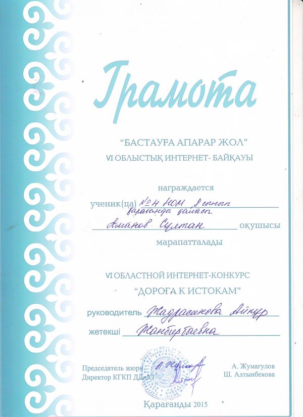 «БАСТАУҒА АПАРАР ЖОЛ» VI облыстық интернет байқауына «Отбасы дәстүрі» тақырыбында эссе жазғаны үшін Дәуренбекова Гүлім(жетекшісі Шукирхан Назгүл) және Аманов Сұлтан (жетекшіс…