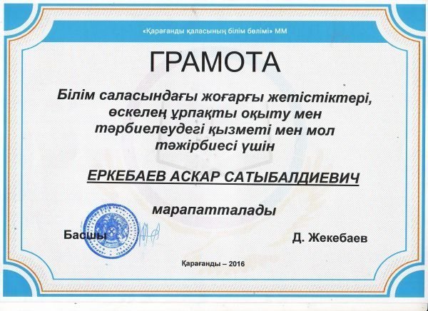 Білім саласындағы жоғарғы жетістіктері, өскелең ұрпақты оқыту мен тәрбиелеудегі қызметі мен мол тәжірибесі үшін мектебіміздің қоғамдық және тарих пәндерінің оқытушысы Еркебаев Аскар Сатыбалдиевич Қа…
