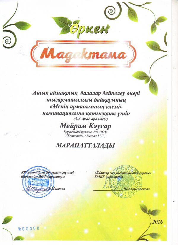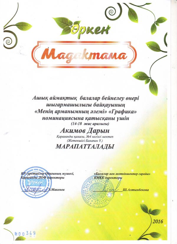 "Өркен" ашық аймақтық балалар бейнелеу өнері шығармашылығы байқауының "Менің арманымның әлемі" номинациясына қатысқаны үшін МАД сыныбының оқушылары Кулахметов Амирхан, Мейрам Кәу…