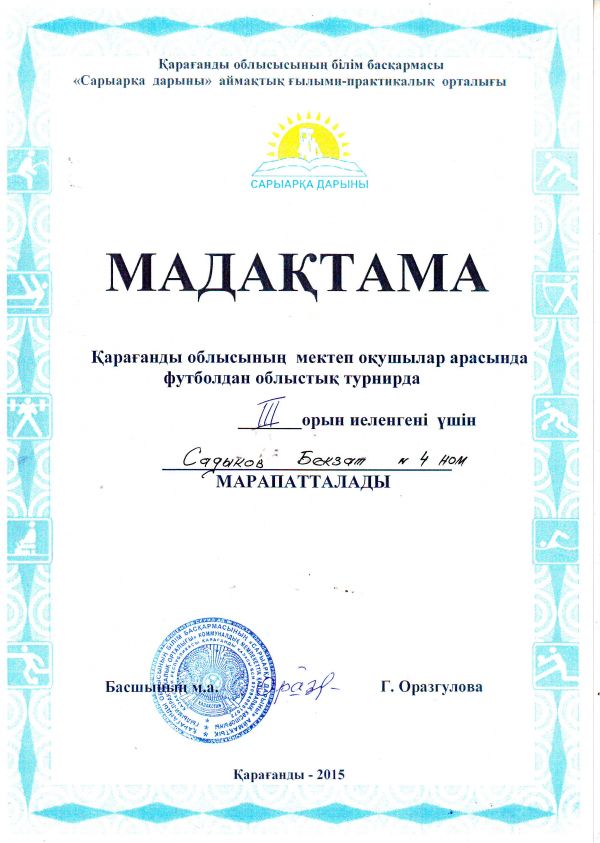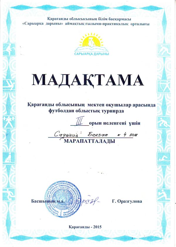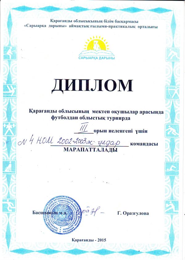 Қарағанды облысының мектеп оқушылар арасында футболдан облыстық турнирда ІІІ орын иеленгені үшін №4 НОМ 2002-2003 ж. ұлдар командасы "Сарыарқа дарыны" аймақтық ғылыми-практикалық орталығын…