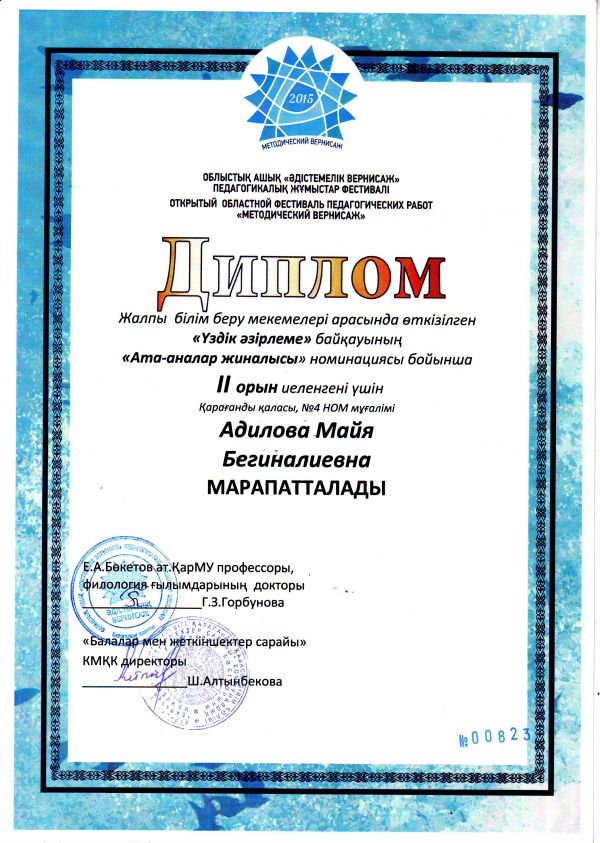 Жалпы білім беру мекемелері арасында өткізілген "Үздік әзірлеме" байқауының "Ата-аналар жиналысы" номинациясы бойынша ІІ орын иеленген №4 НОМ мұғалімдері Адилова М.Б. және "…