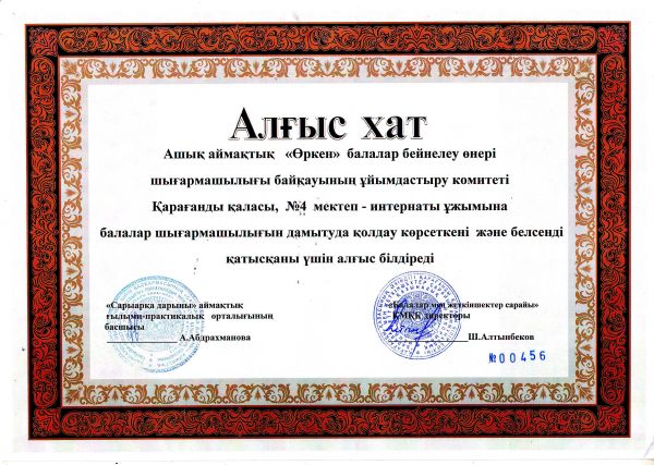 Ашық аймақтық "Өркен" балалар бейнелеу өнері шығармашылығы байқауының ұйымдастыру комитеті №4 НОМ ұжымына балалар шығармашылығын дамытуда қолдау көрсеткені және белсенді қатысқаны үшін алғ…