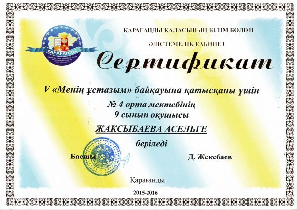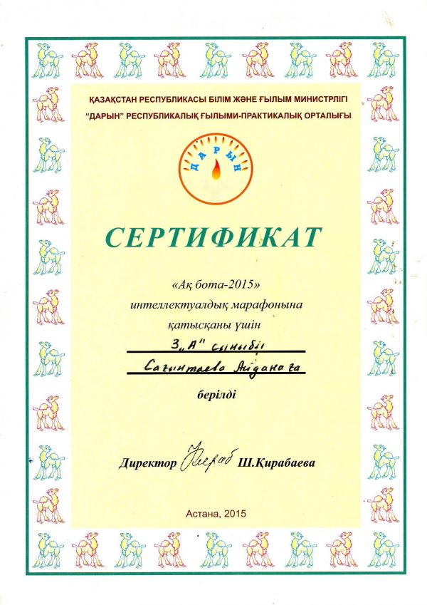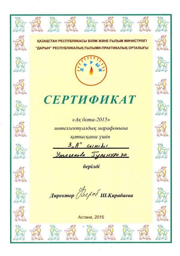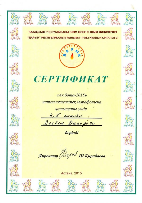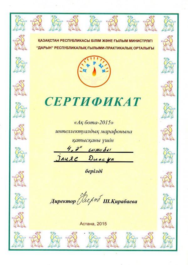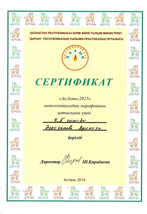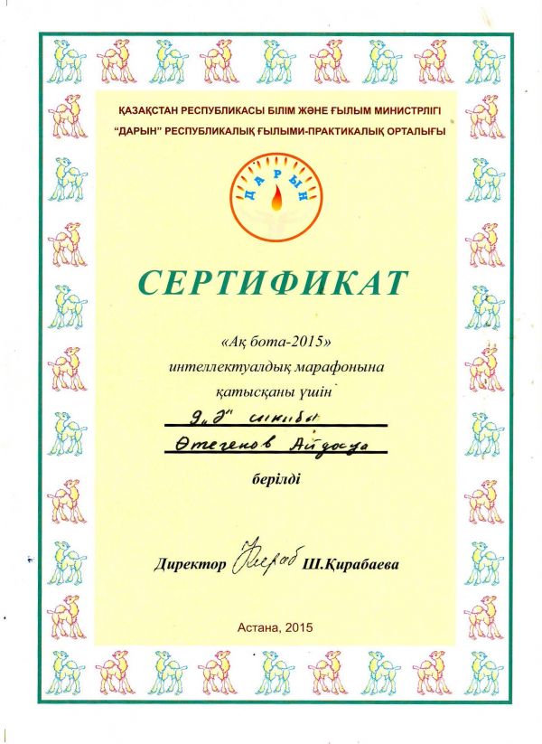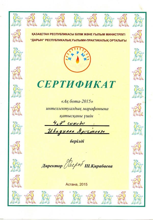"Ақбота-2015" интеллектуалдық марафонына қатысқаны үшін №4 НОМ-нің 3-9 сынып оқушылары "Дарын" республикалық ғылыми-практикалық орталығының сертификаттарымен марапатталды.