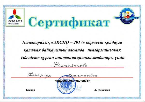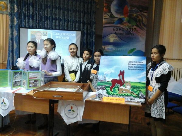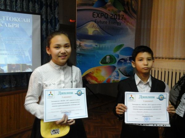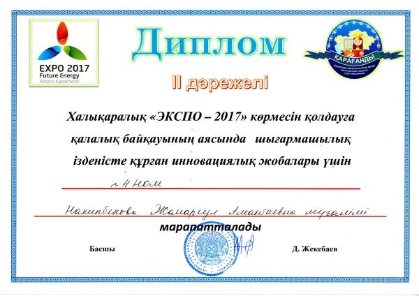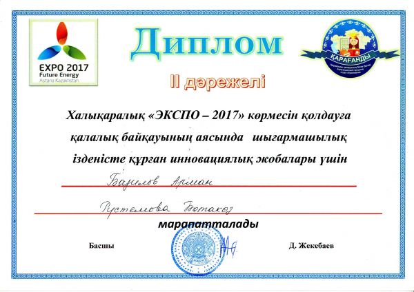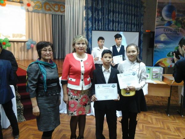 №57 мектеп-лицейінде өткен Халықаралық "Экспо-2017" көрмесін қолдауға қалалық байқауының аясында шығармашылық ізденісте құрған инновациялық жобалары үшін №4 НОМ-тің оқушылары Рүстемова Бот…