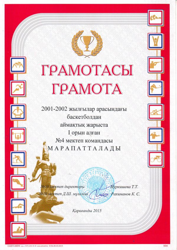 №10 ЖББОМ-те өткен 2001-2002 жылғылар арасындағы баскетболдан аймақтық жарыста №4 НОМ командасы І орын алып, грамотамен марапатталды.