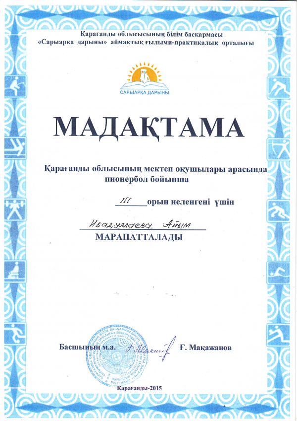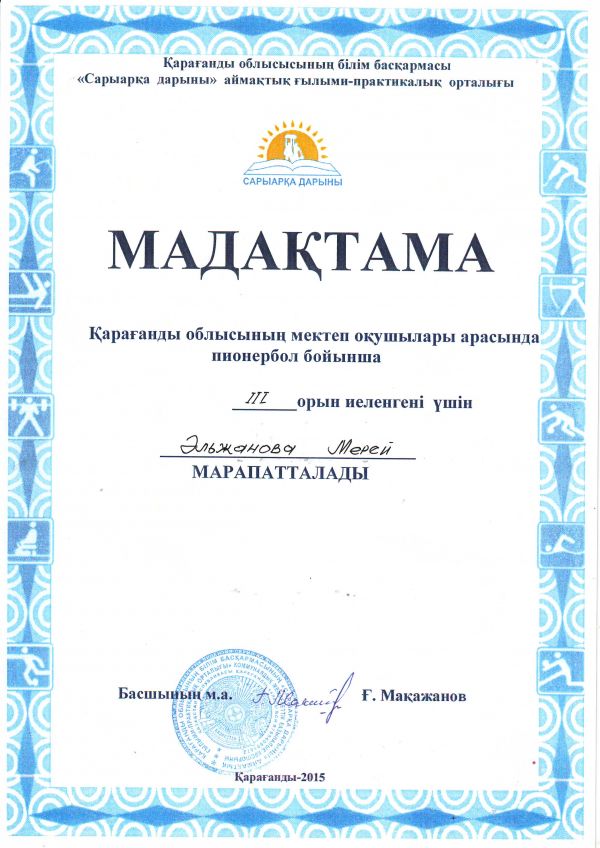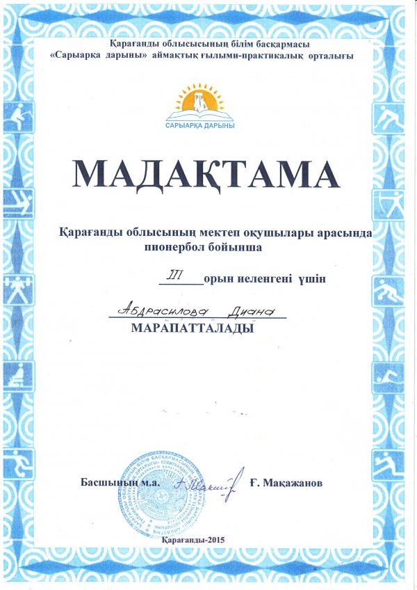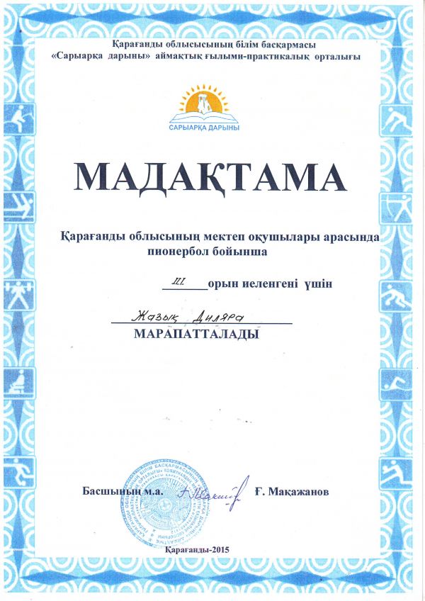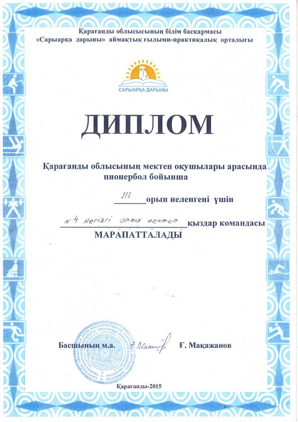 Қарағанды облысының мектеп оқушылары арасында пионербол ойынынан №4 НОМ қыздар командасы ІІІ орын иеленгені үшін Қарағанды облысының білім басқармасы "Сарыарқа дарыны" аймақтық ғылыми-прак…