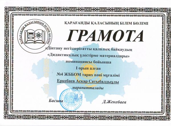 "Дінтану негіздері" атты қалалық байқаудың "Дидактикалық үлестірме материалдары" номинациясы бойынша №4 НОМ мұғалімі Еркебаев Асқар Сатыбалдыұлы І орын алды.