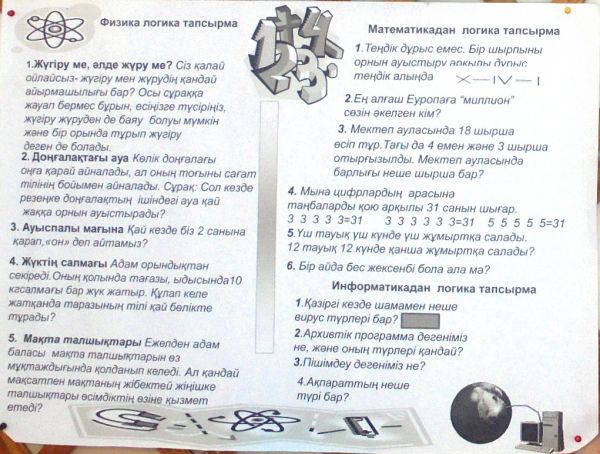 22.01.2015 жылы №4 негізгі орта мектебінде «Нақты ғылымдар еліне саяхат» Не? Қайда? Қашан? зияткерлік сайысы 9-сыныптар арасында өтті.