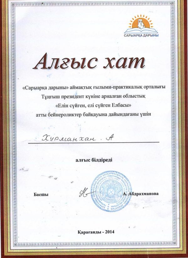 Қазақстан оқу ассоциасиясы 10 қаңтар 2015 жылы өткізілген "Сыни ойлау арқылы нәтижеге" тақырыбындағы облыстық семинарға белсене қатысқаны үшін №4 негізгі орта мектеп мұғалімі Кулбулатова Қ…