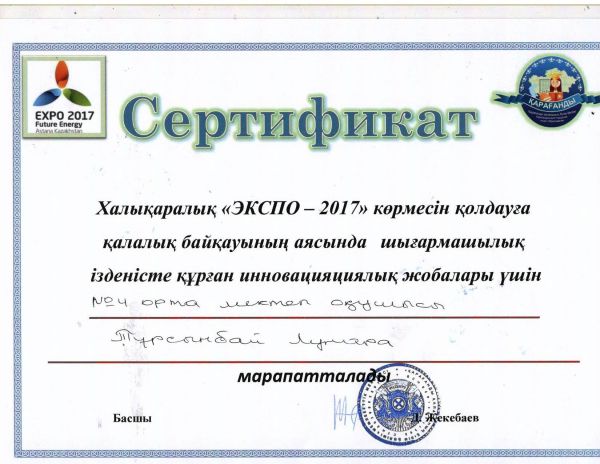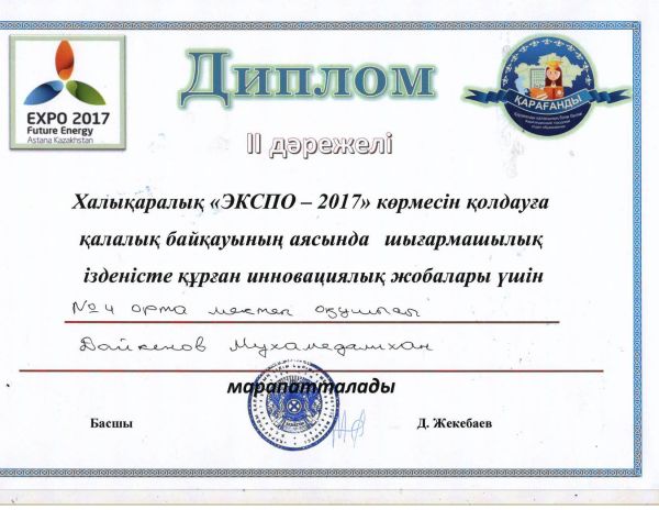 Халықаралық "ЭКСПО - 2017" көрмесін қолдауға арналған  қалалық байқауының аясында шығармашылық ізденісте құрған инновациялық жобалары үшін №4 негізгі орта мектеп оқушысы Дайкенов Мұха…