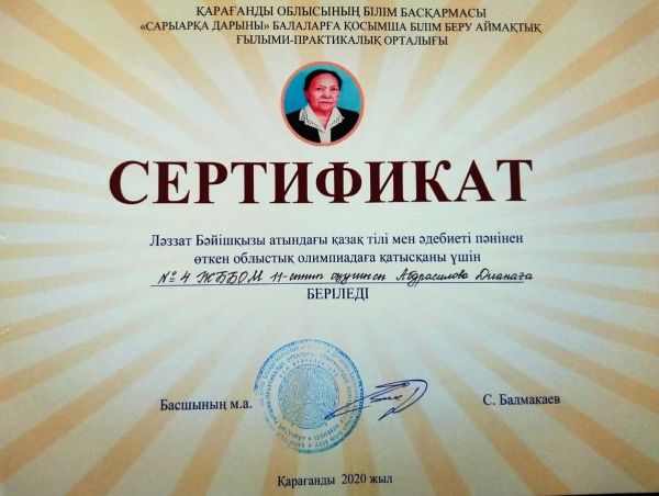 Мектебіміздің 11-сынып оқушысы Абдрасилова Диана Е.А. Бөкетов атындағы Қарағанды Мемлекеттік Университетінде өткен пән олимпиадасында мадақтамаға ие болды.