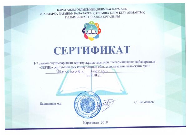 1-7 сынып оқушыларының зерттеу жұмыстары мен шығармашылық жобаларының "Зерде" республикалық конкурсының облыстық кезеңінде ІІІ орынға ие болғаны үшін мектебіміздің 6 сынып оқушысы Төлегено…