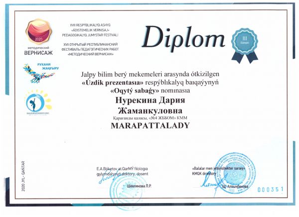 Жалпы білім беру мекемелері арасында өткізілген "Үздік презентация" республикалық байқауының "Оқыту сабағы" номинациясы бойынша мектебіміздің мұғалімдері ІІІ дәрежелі дипло…