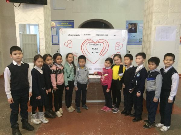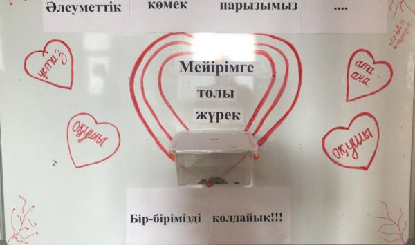 Өзін-өзі тану апталығының аясында мектебіміздің бір бұрышына "Мейірімге толы жүрек "атты қайырымдылық шарасы өтуде.