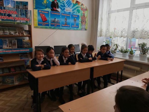 № 4 Жалпы білім беретін орта мектебінің кітапханасында 30.11.2018 ж. 1-ші желтоқсан "ҚР-нің Тұңғыш Президент күніне" арналған 4"А" мен 4"Ә" сынып оқушылары арасында&nbs…