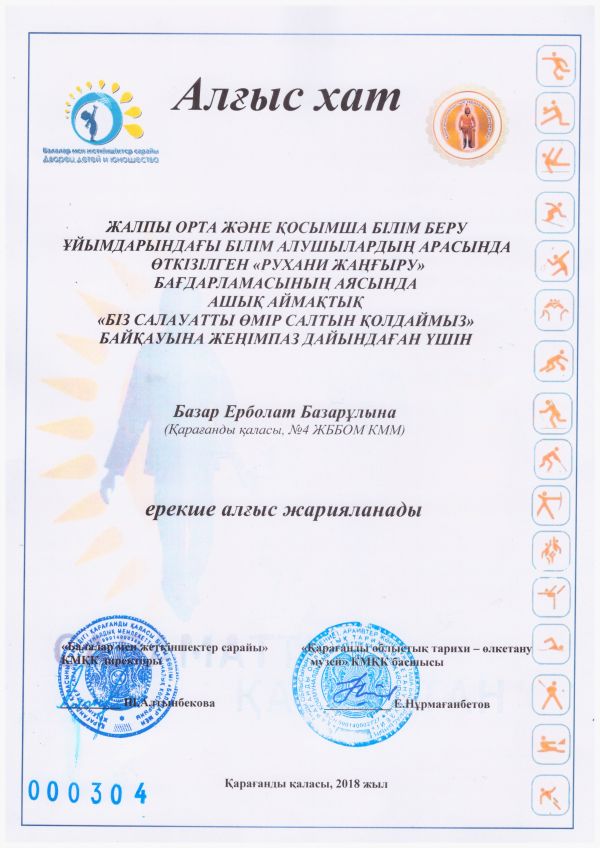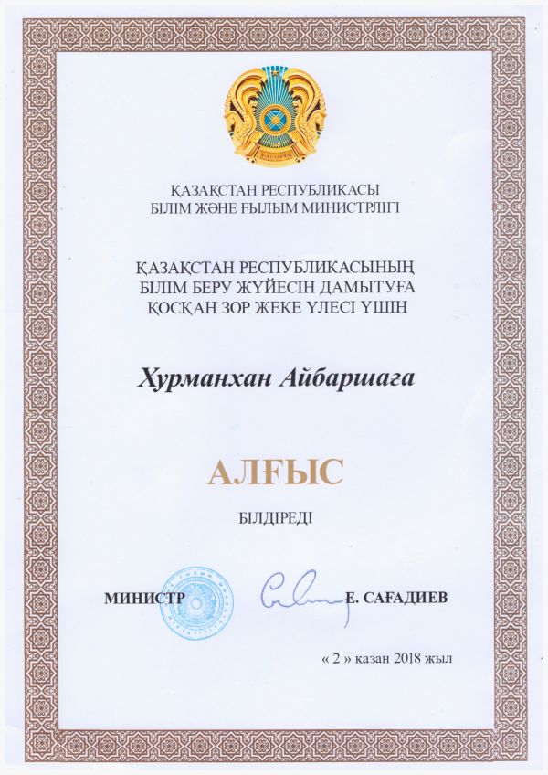 ҚАЗАҚСТАН РЕСПУБЛИКАСЫНЫҢ БІЛІМ БЕРУ ЖҮЙЕСІН ДАМЫТУҒА ҚОСҚАН ЗОР ЖЕКЕ ҮЛЕСІ ҮШІН МЕКТЕБІМІЗДІҢ БАСТАУЫШ СЫНЫП МҰҒАЛІМІ ХУРМАНХАН АЙБАРША ҚАЗАҚСТАН РЕСПУБЛИКАСЫНЫҢ ҒЫЛЫМ ЖӘНЕ БІЛІМ МИНИСТРІ Е. САҒАДИ…