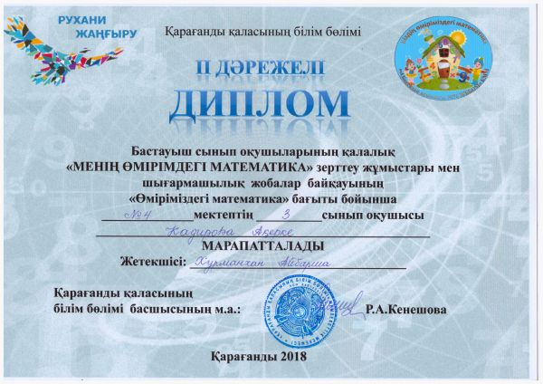 Қалалық бастауыш сынып оқушыларының "Менің өмірімдегі математика" зерттеу жұмыстары мен шығармашылық жобалар байқауының "Өміріміздегі математика" бағыты бойынша мектебіміздің 3 с…