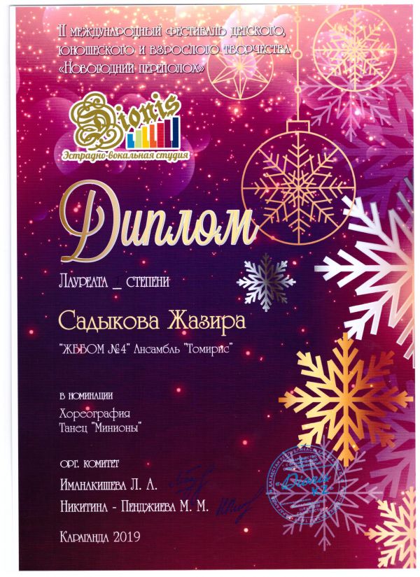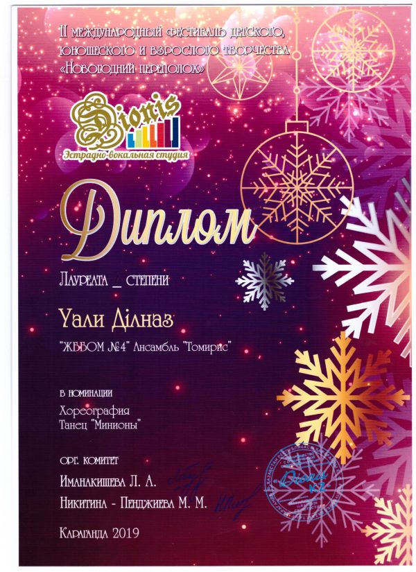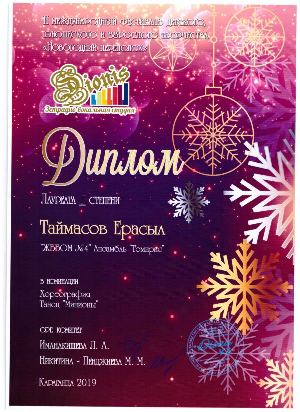 "Жаңа жылдық мереке"  балалар, жасөспірімдер және ересектер шығармашылығының ІІ Халықаралық фестивалінде  хореография номинациясында №4 ЖББОМ мектебінің "Томирис" ансам…