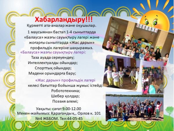 1 маусымнан бастап 1-4 сыныптарда «Балауса» жазғы сауықтыру лагері және жоғарғы сыныптарда «Жас дарын» профильдік лагеріне шақырамыз.