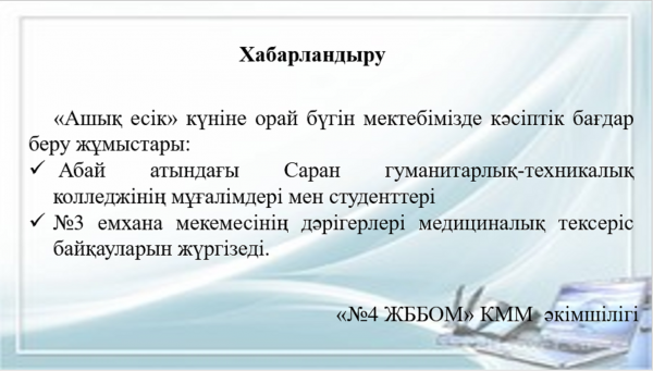 «Ашық есік» күніне орай бүгін мектебімізде кәсіптік бағдар беру жұмыстары: Абай атындағы Саран гуманитарлық-техникалық колледжінің мұғалімдері мен студенттері №3 емхана мекемесінің д…