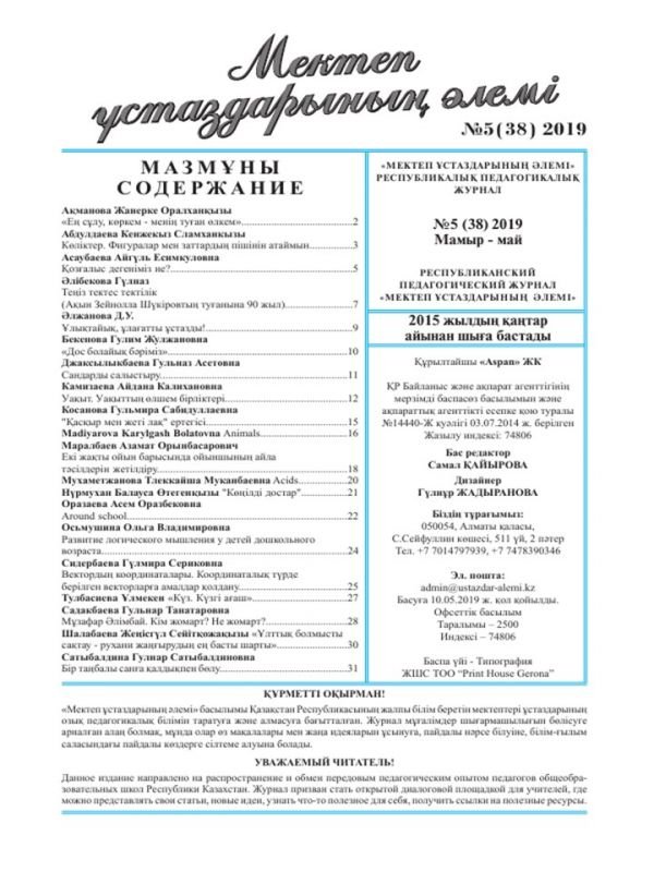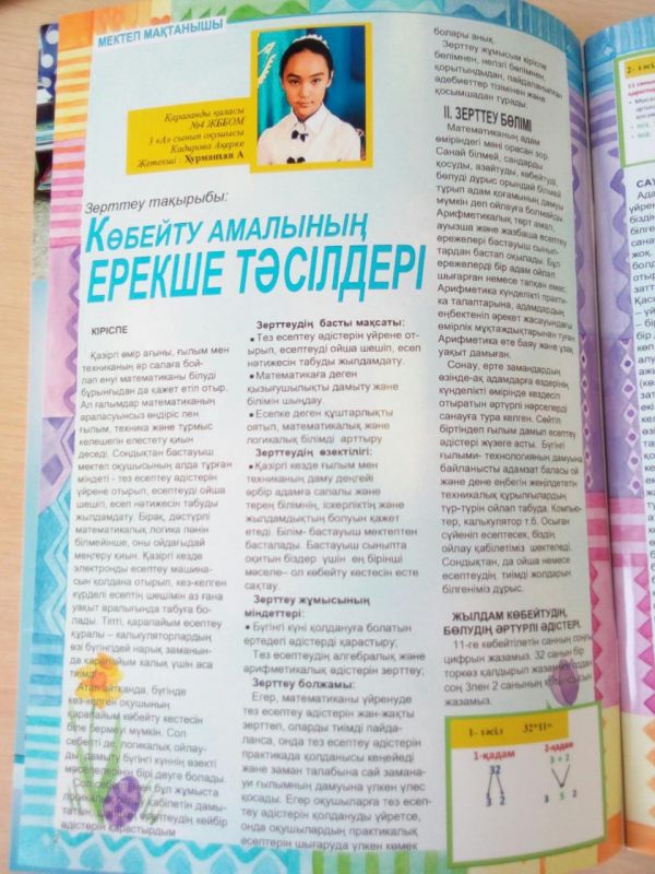 Республикалық "Балалар шығармашылығы" журналына мектебіміздің 3 "А" сынып оқушысы Кадирова Ақеркенің "Көбейту амалының ерекше тәсілдері" тақырыбындағы жұмысы мақала рет…