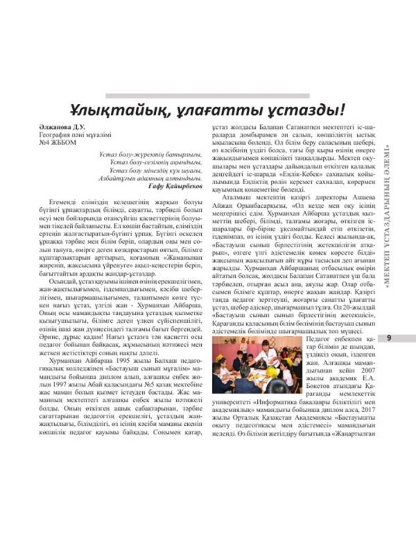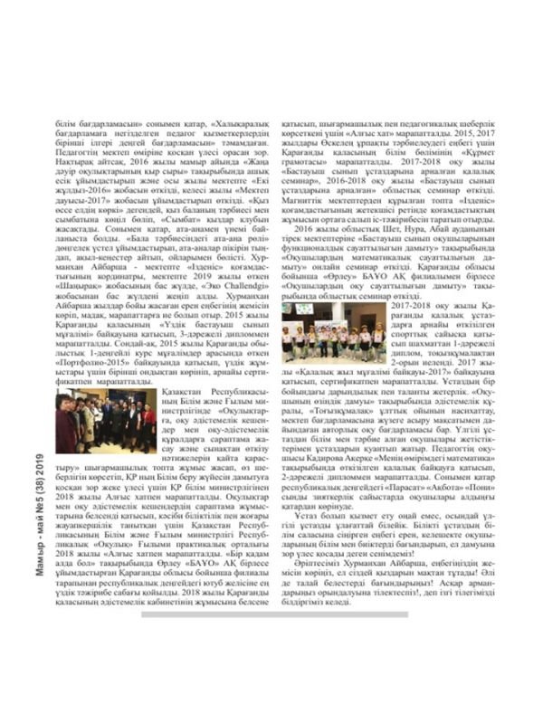 «Мектеп ұстаздарының әлемі атты» Республикалық педагогикалық журналының сыртқы мұқабасы мектебіміздің бастауыш сынып мұғалімі Хурманхан А. бейнесімен жарық көрді. Осы журналға "Ұлық…