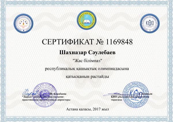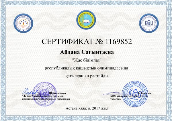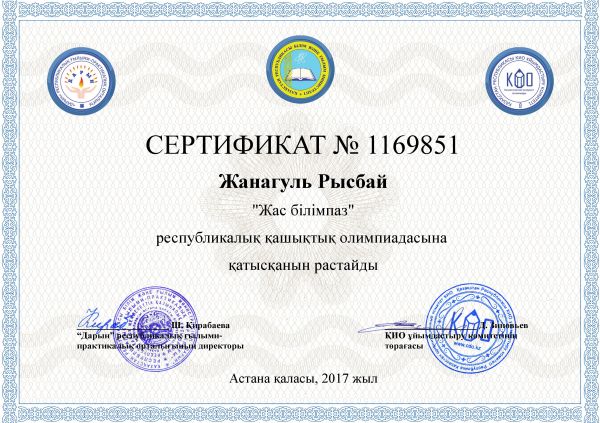 "Жас білімпаз" республикалық қашықтық олимпиадасының сертификат иегерлерін құттықтаймыз.