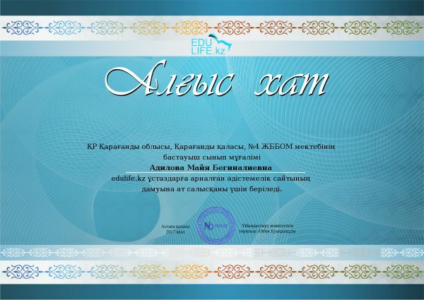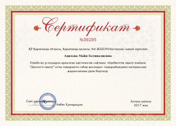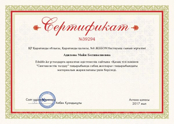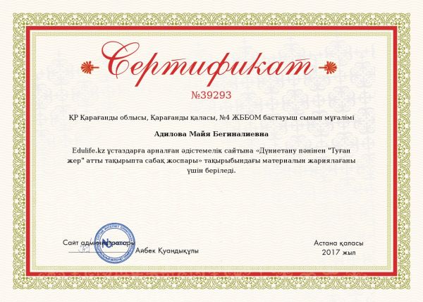 Edulife.kz ұстаздарға арналған әдістемелік сайтына материалдар жариялағаны үшін бастауыш сынып мұғалімі Адилова М.Б. сертификаттарға ие болды.