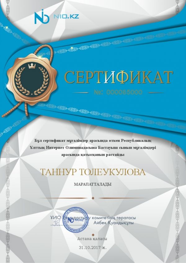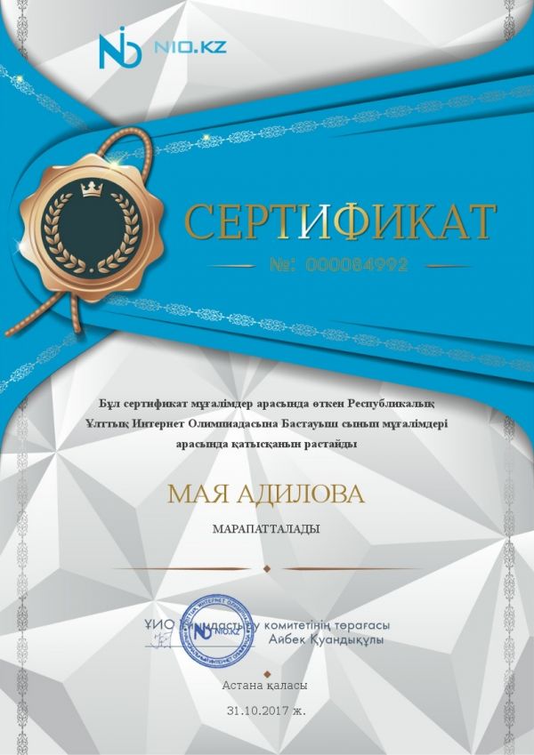 Мектебіміздің 4 сынып оқушылары NIO-Республикалық интернет олимпиадасына қатысып, жоғары нәтижелер көрсетті.