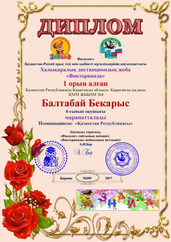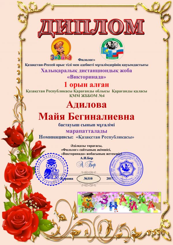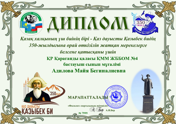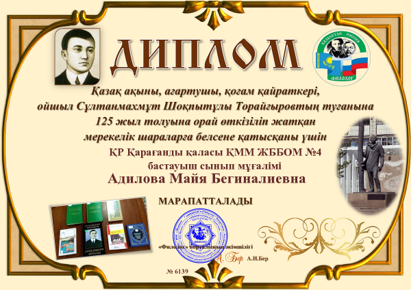 "Филолог" порталындағы жобаларға қатысып, маатериалдар жариялағаны үшін бастауыш сынып мұғалімі Адилова М.Б. әртүрлі марапаттарға ие болды.