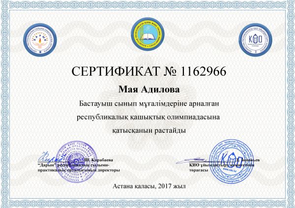 Бастауыш сынып мұғалімдеріне арналған республикалық қашықтық олимпиадасына қатысқаны үшін мектебіміздің мұғалімдері Адилова М.Б. және Толеукулова Т.Н. сертификаттарға ие болды.