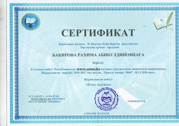 №4 ЖББ орта мектептің бастауыш сынып мұғалімі Бакирова Рахима А…