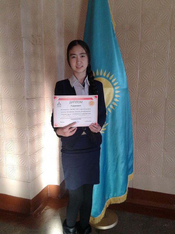 23.11.16ж Ана тілінің мәртебесін көтеру мақсатында өтілген қалалық байқауға катысып, өзінің тапқырлығы мен өнері үшін көзге түскен 7 "А" сынып оқушысы Мұқаш Мейрамбек III дәрежелі дипломме…