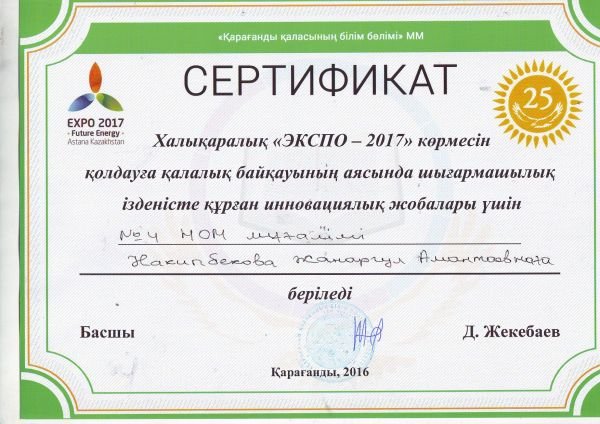 Халықаралық "ЭКСПО-2017" көрмесінің қалалық деңғейіне қатысып, №4 ЖББОМ 8-сынып оқушысы Абдрасилова Диана II дәрежелі диплом алғанымен құттықтаймыз. Жетекшісі: Накипбекова.Ж.А физика…