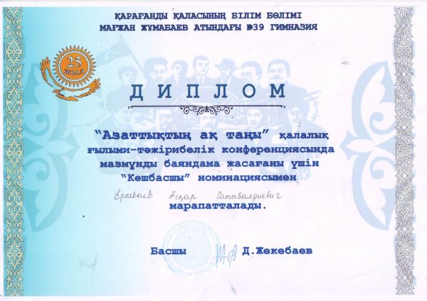 "Азаттықтың ақ таңы" қалалық ғылыми - тәжірибелік конференциясында мазмұнды баяндама жасағаны үшін "Көшбасшы" номинациясымен Еркебаев Асқар Сатыбалдиевич дипломмен марапатт…