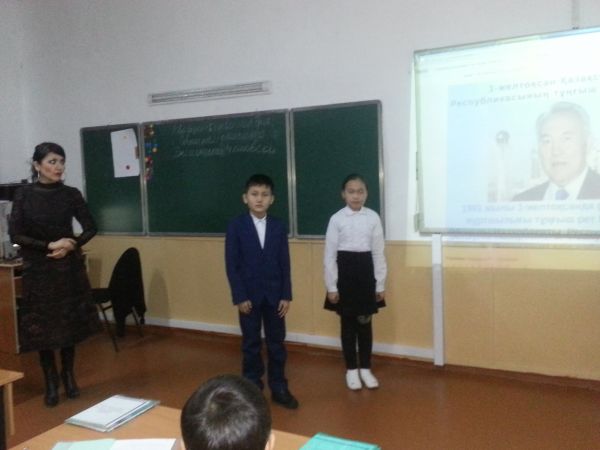 30.11.2015 күні 1 желтоқсан «Қазақстан Ресбуликасының Тұңғыш Президент күніне» орай 2 "А" сыныбында "Елбасым-мақтанышым" тақырыбында сынып сағаты өткізілді. Сынып жет…