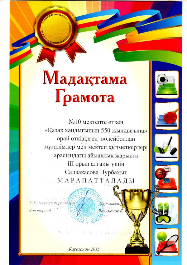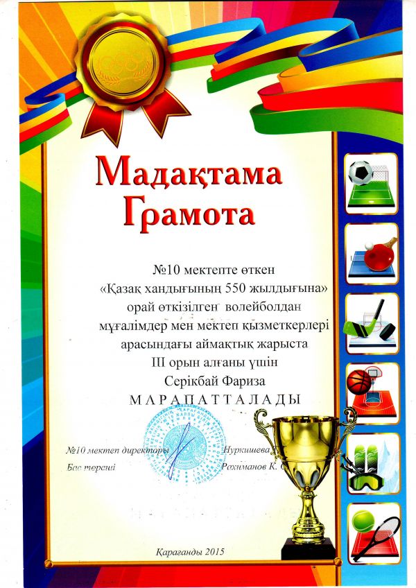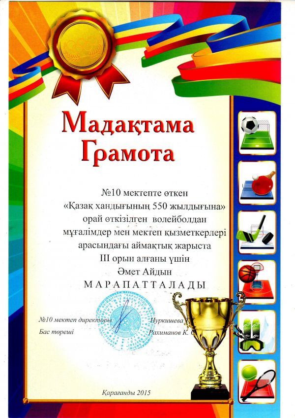 №10 мектепте өткен "Қазақ хандығының 550 жылдығына" орай өткізілген волейболдан мұғалімдер мен мектеп қызметкерлері арасындағы аймақтық жарыста ІІІ орын алған №4 мектеп командасы грамотаме…