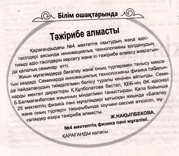 №4 НОМ-те физика пәні бойынша үздік тәжірибе "Орталық Қазақстан" газетіне арнайы мақала жазылып, тәжірибе таратылды.