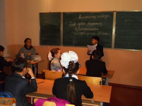 №4 негізгі орта мектепте 09.02.2015 жылы "Кеңес Одағының Ауғаныстаннан шығарылуына 26 жыл" тақырыбында сынып сағаттары өткізілді. Қатысушылар 1-9 сынып оқушылары, мұғалімдер.