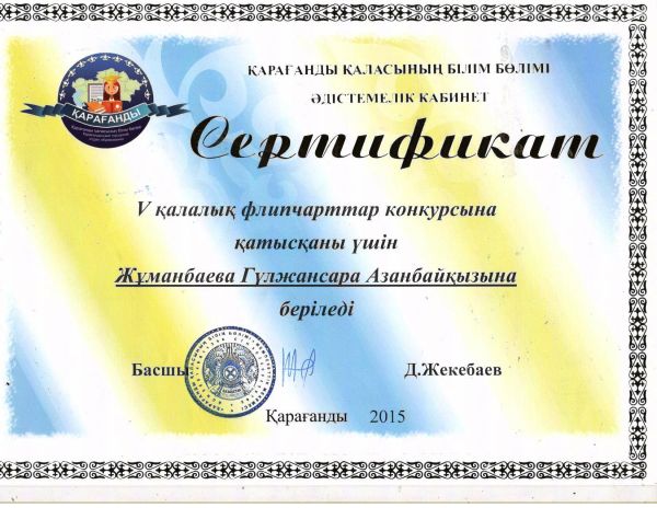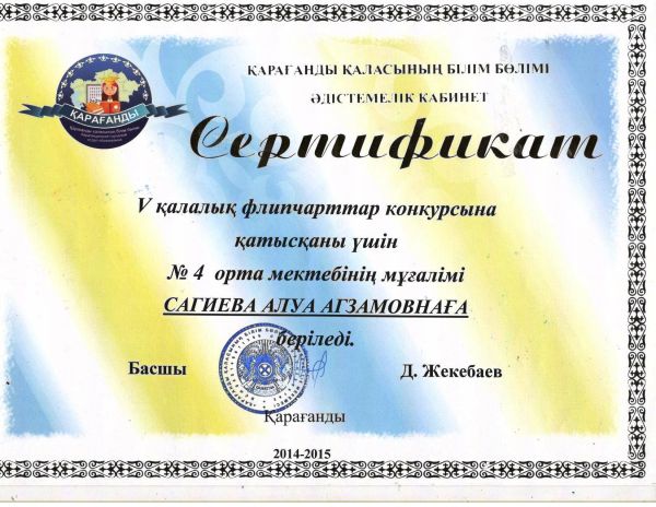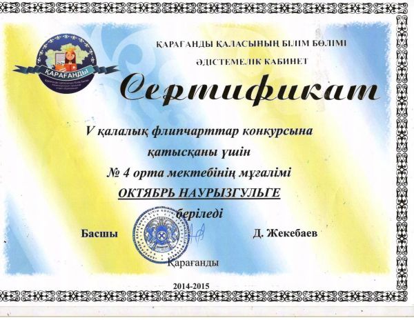 №4 негізгі орта мектеп мұғалімдері V қалалық флипчарттар конкурсына қатысқаны үшін сертификаттарға ие болды. Сертификат иегерлері: бастауыш сынып мұғалімі - Жуманбаева Гүлжансара Азанбаевна, физика…