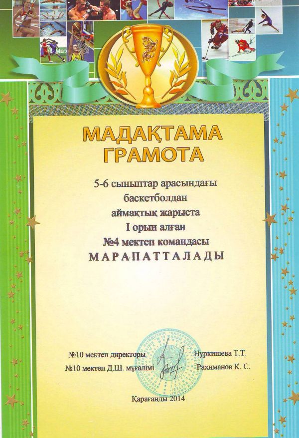 №4 НОМ 5-6 сыныптар құралған командасы баскетболдан №10 мектепте өткен аймақтық жарыста І орын иеленді.