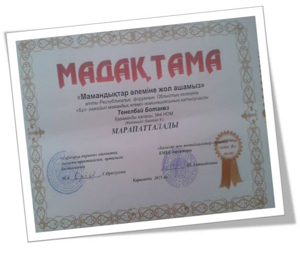 «Мамандықтар әлеміне жол ашамыз» атты Республикалық форумның облыстық кезеңінің «Бұл ғажайып мамандықтар әлемі» номинациясы бойынша Акимов Дарын, Ибадуллаева Арайлым, Тенелба…