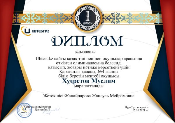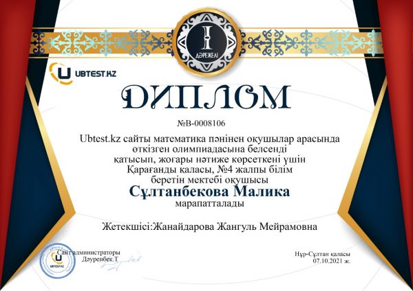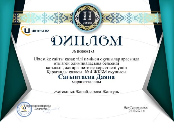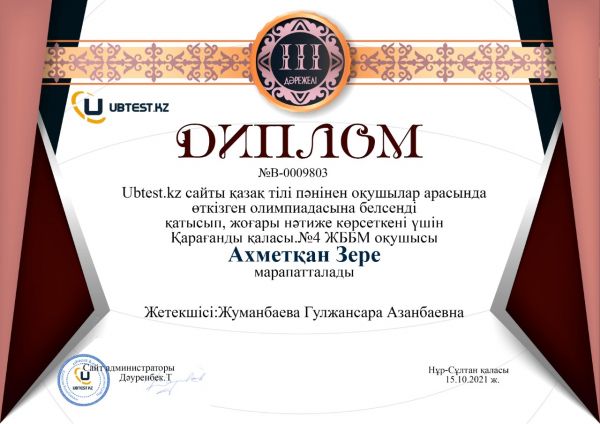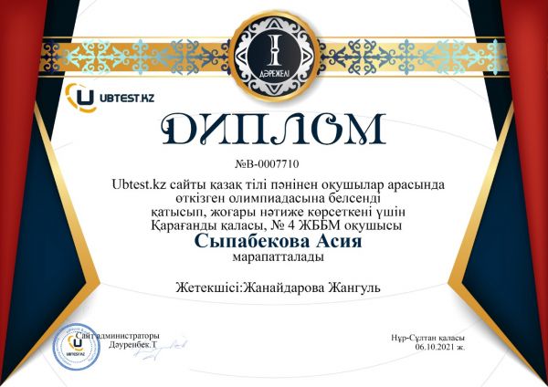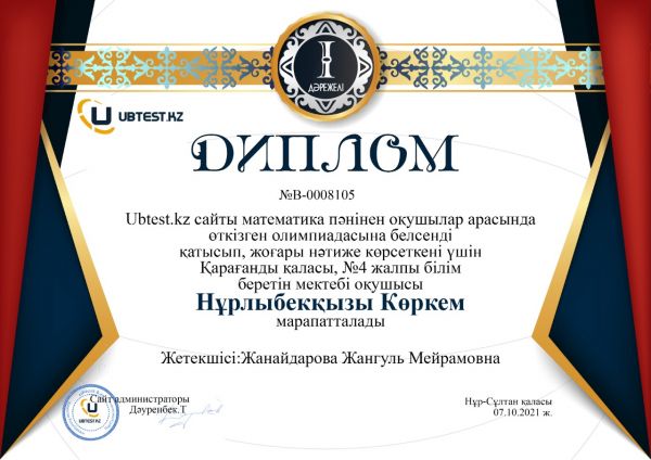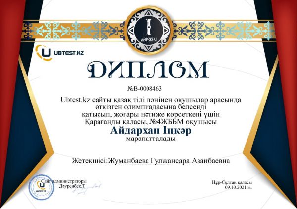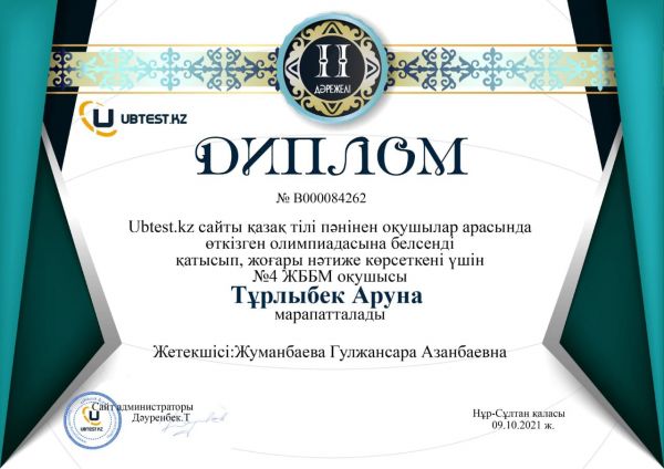 Ubtest.kz сайты қазақ тілі мен математика пәндері арасында өткізілген олимпиадасына белсенді қатысып, жоғары нәтиже көрсеткені үшін №4 ЖББМ 4"А,Ә" сынып оқушылары І, ІІ, ІІІ дәрежелі дипло…
