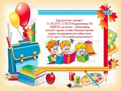 №4 ЖББОМ 01.08.2019- 25.08.2019 аларығында, сағат 10:00-11:00 ге дейін " Балақайлар мектебі" 1- сыныпқа келетін бүлдіршіндер үшін жұмыс істейтінін хабарлаймыз!